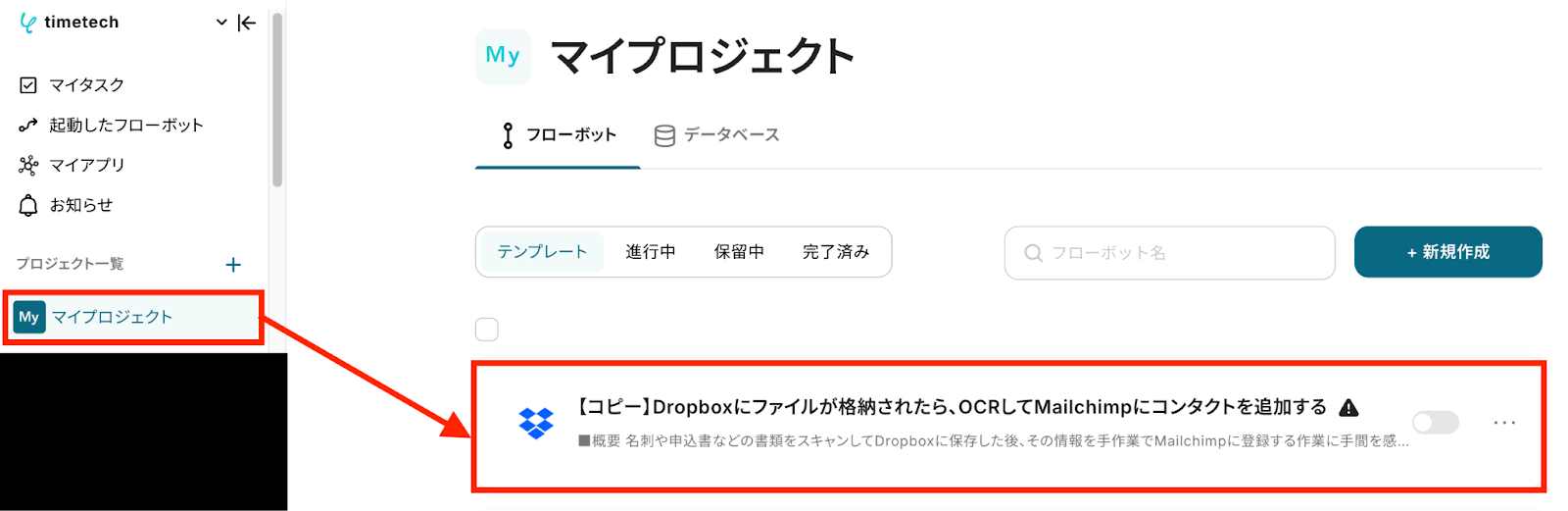 左側にあるメニューの「マイプロジェクト」から、コピーしたテンプレートを開きます。