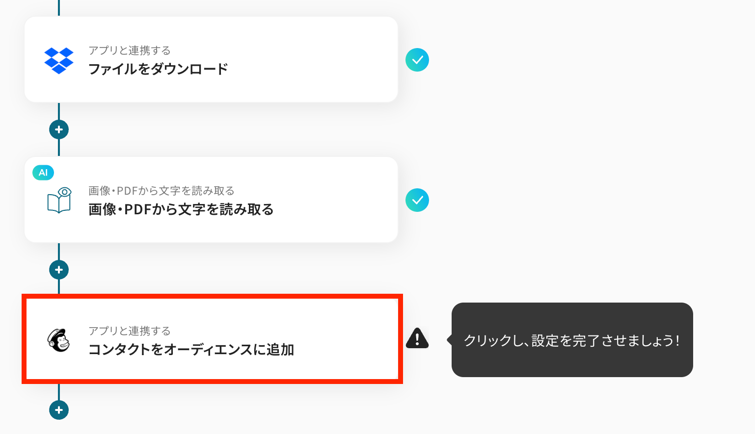 以上が、Dropboxにファイルが格納されたら、OCRしてMailchimpにコンタクトを追加する連携手順になります!