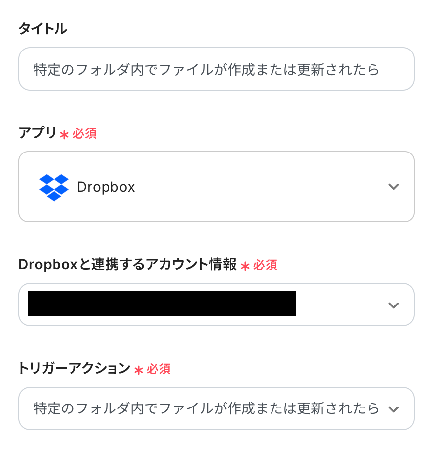 「トリガーアクション」:デフォルトで「特定のフォルダ内でファイルが作成または更新されたら」が選択されているので、そのままでOKです!