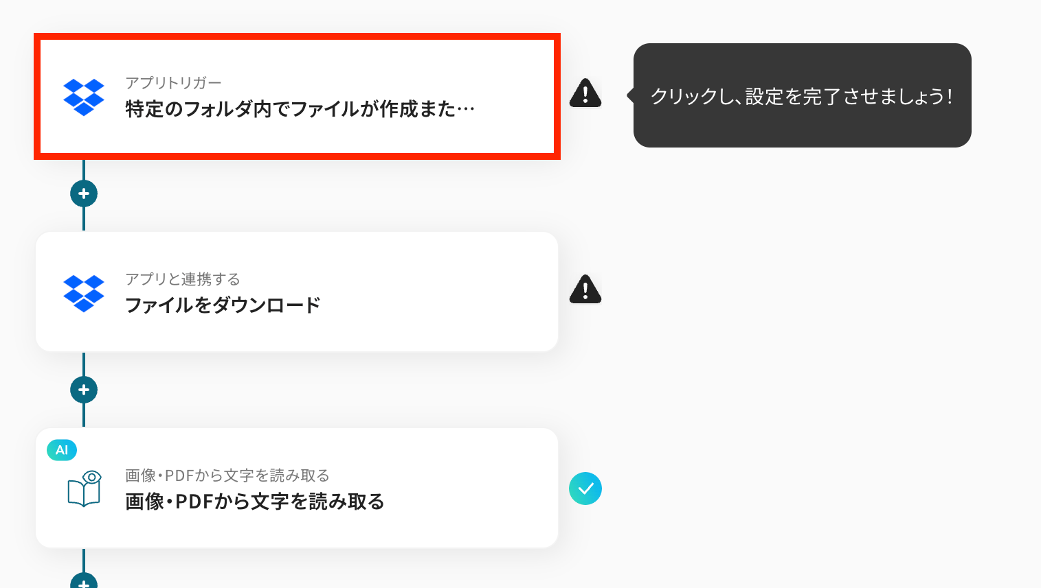 - Dropboxのトリガー設定およびOCRとMailchimpのアクション設定