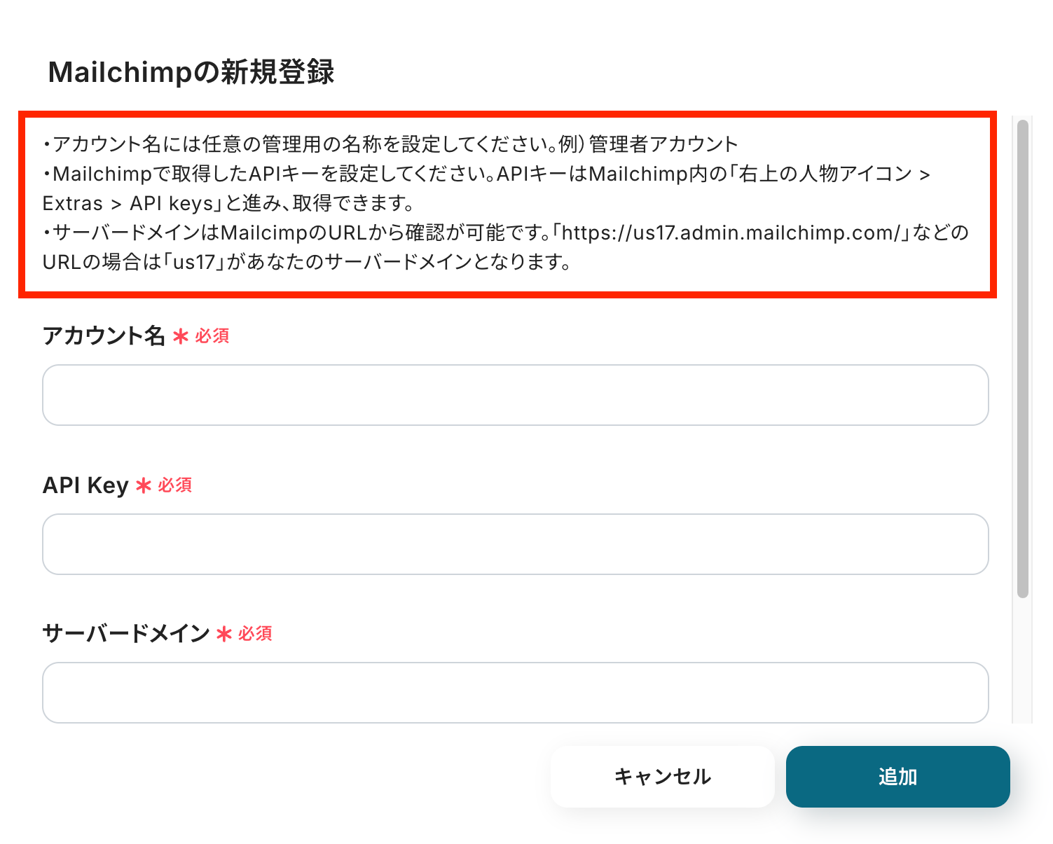 赤枠部分の説明文を確認しながら「アカウント名」「API Key」「サーバードメイン」を入力して「追加」をクリックしたら連携完了です!