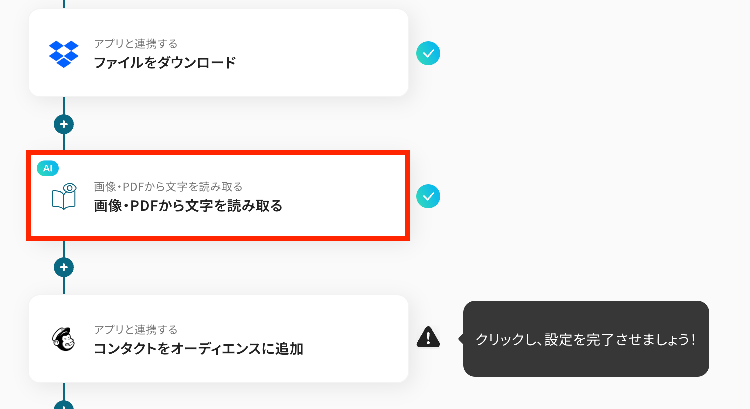 Dropboxの指定フォルダに名刺や申込書などのファイルが追加されると、OCR機能がファイル内の文字情報を自動で読み取り、その情報をもとにMailchimpへ新しいコンタクトとして自動で登録できます。