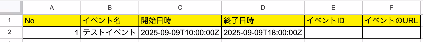 今回はテスト用に以下の内容で作成しました。なお、最終設定でEventbriteに作成したイベントIDをGoogle スプレッドシートに反映させるため、E列にイベントID欄を作成しています。現段階でこの列は空欄で問題ありません。