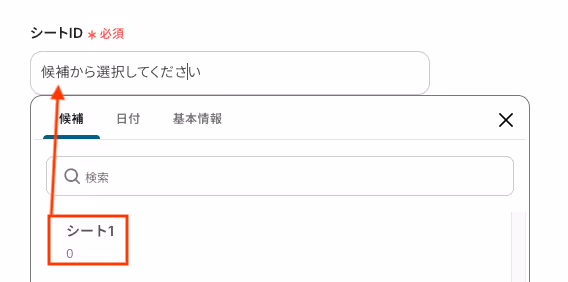 続けて、スプレッドシートIDとシートIDは、入力欄をクリックすると連携が有効になっているアカウントから候補が表示されるので、対象の項目を選択しましょう。