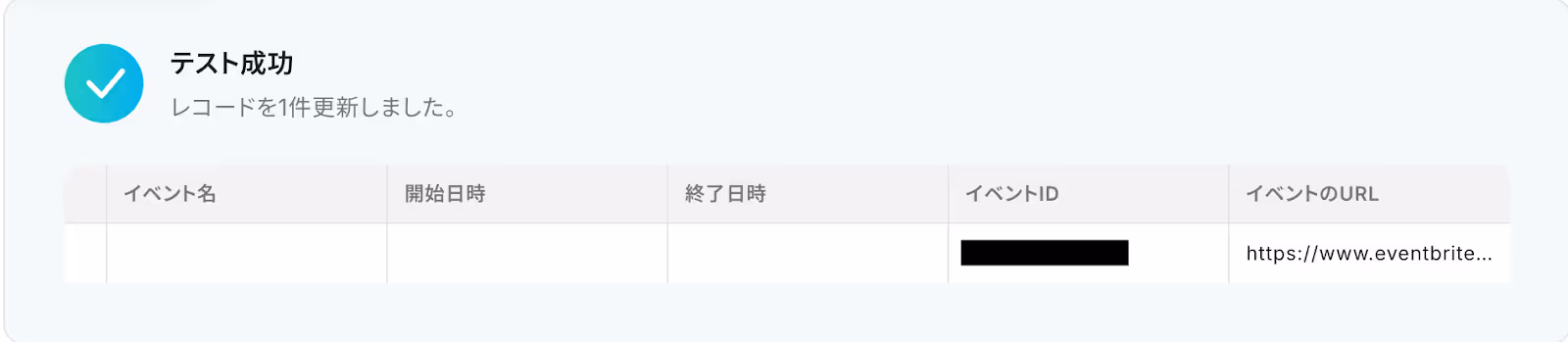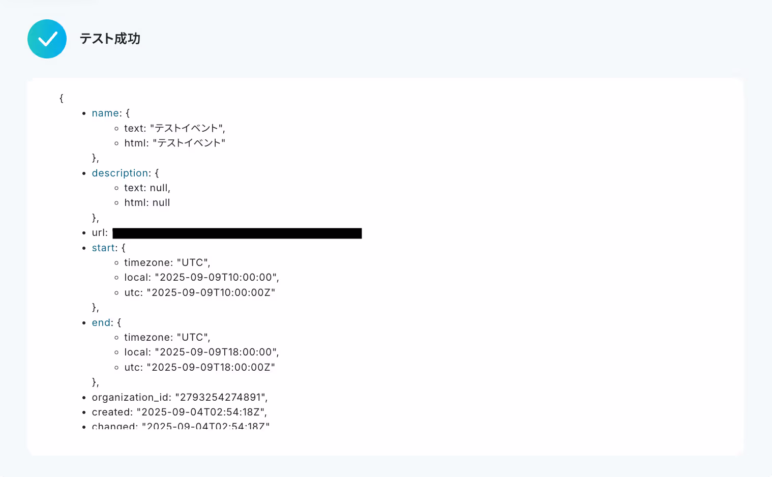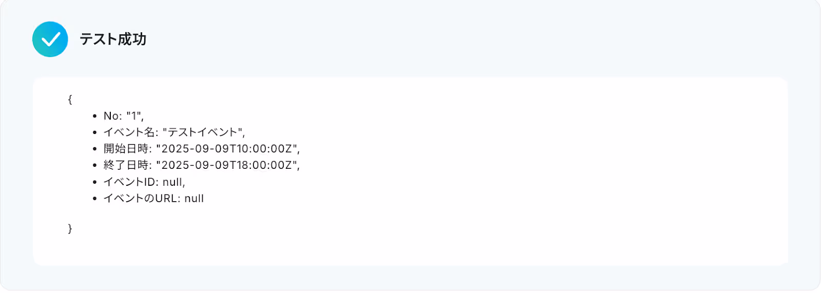 テストが成功すると、作成されたイベントの情報が一覧で表示されます。