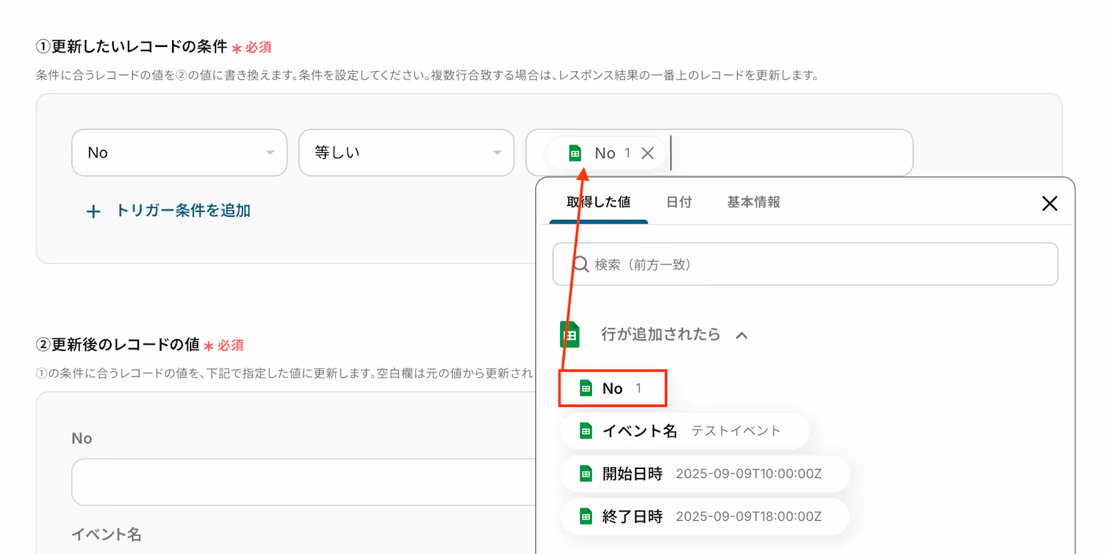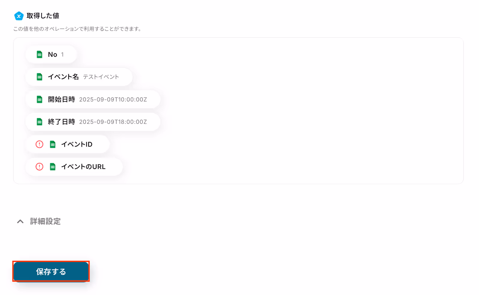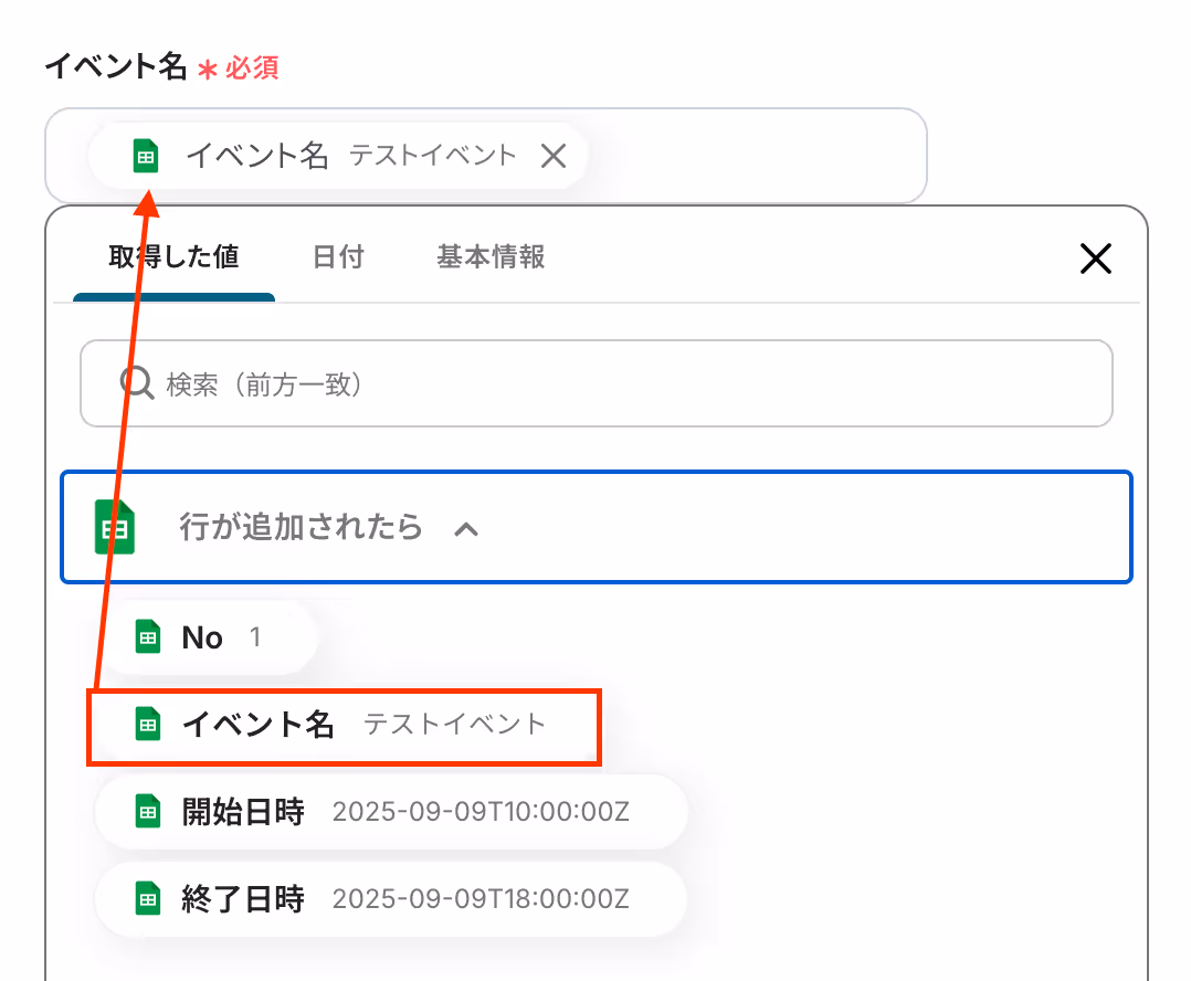 こちらもイベント名と同じく、入力欄をクリックすると取得した値が表示されるので、選択して入力しましょう。