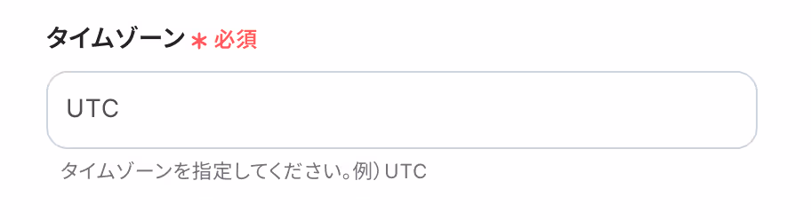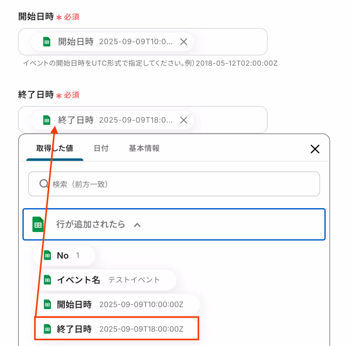 日本時間のまま入力すると後続ステップでエラーになるため、事前にUTC形式へ変換した値をスプレッドシートに記載してください。