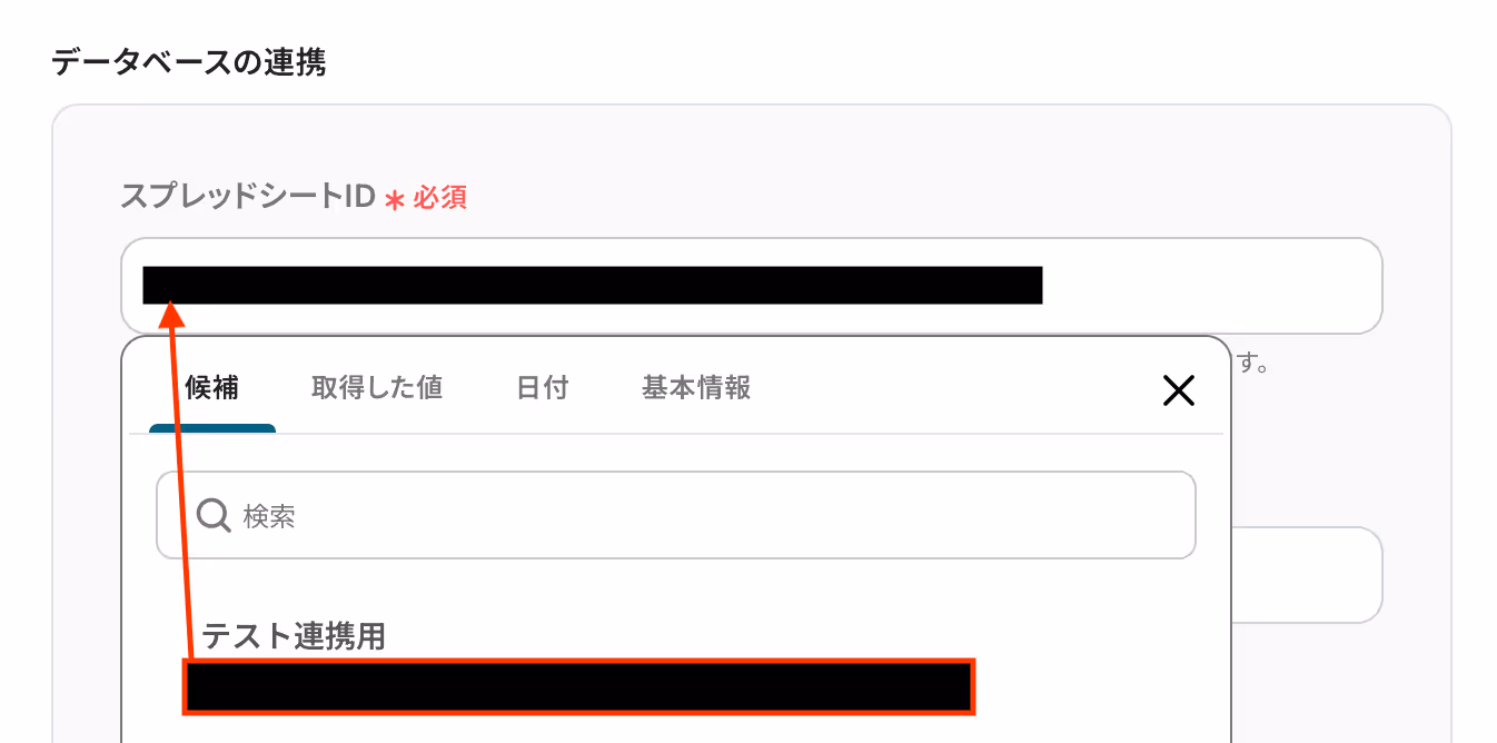 入力欄をクリックすると、前のステップでGoogle スプレッドシートから取得した値が表示されるので、選択して入力しましょう。