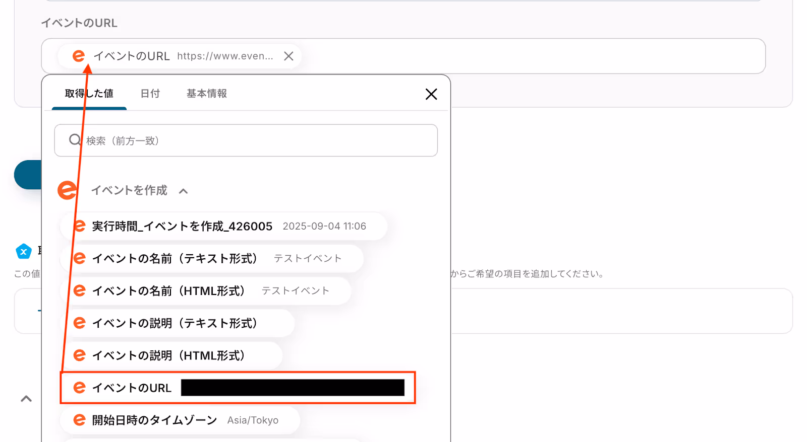 入力欄をクリックすると、前のステップでEventbriteから取得済みのアウトプットが表示されるので選択して入力しましょう。