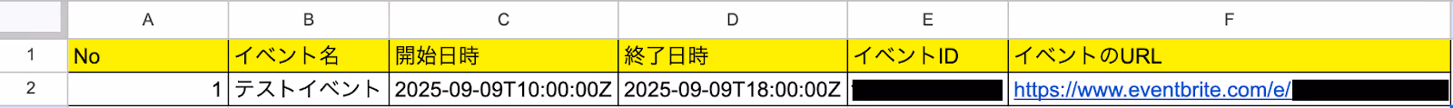 実際にGoogleスプレッドシートにテスト用の行を追加し、Eventbriteにイベントが作成されるかを確認してみましょう。