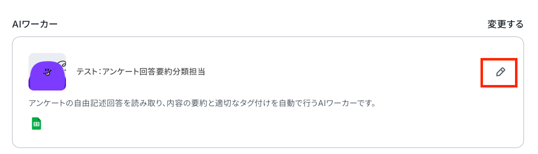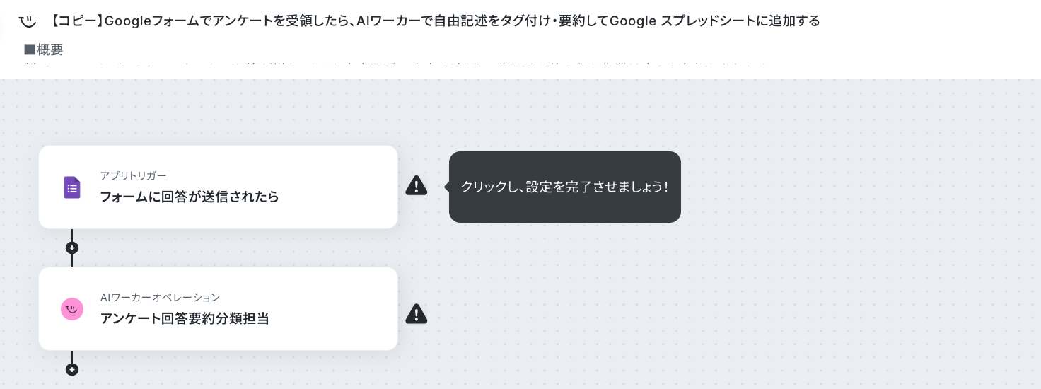 Googleフォームでアンケートを受領したら、AIワーカーで自由記述をタグ付け・要約してGoogle スプレッドシートに追加するテンプレートを用意しています。