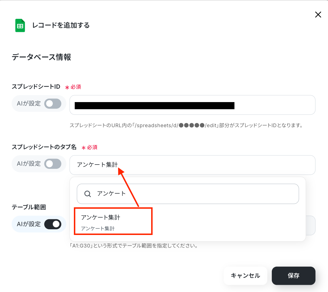 ・Google スプレッドシートの操作時、テーブル機能が設定されている範囲には書き込みができない場合があるため、通常のセル範囲を指定して実行してください。
