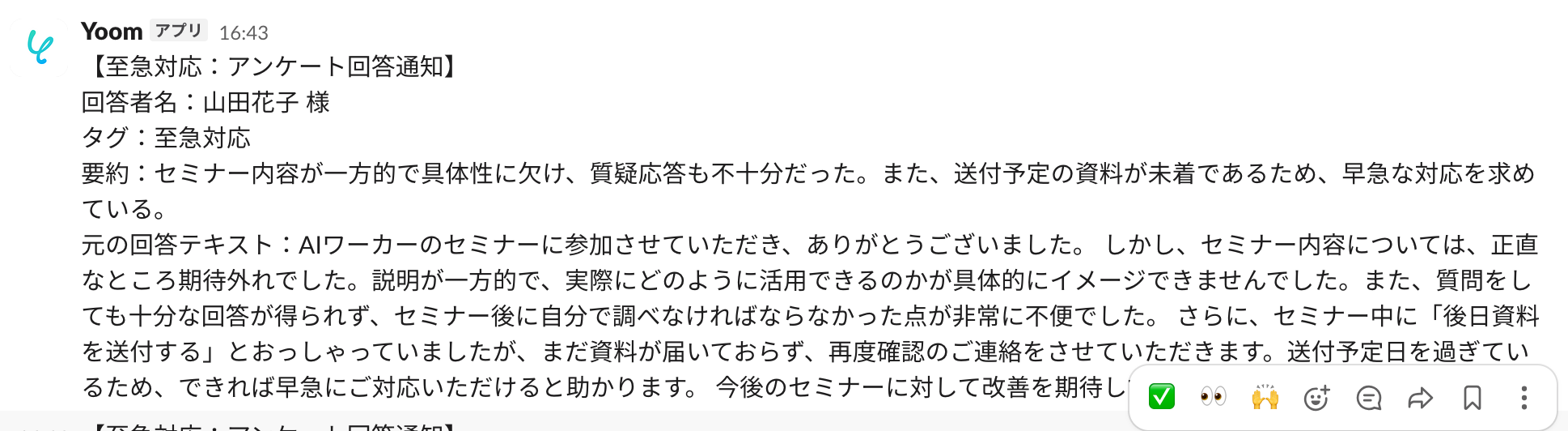 AIエージェントが「クレーム」や「至急対応」といった特定のタグを付けた場合のみ、担当者のSlackやMicrosoft Teamsに通知を送り、素早いフォローを促します。