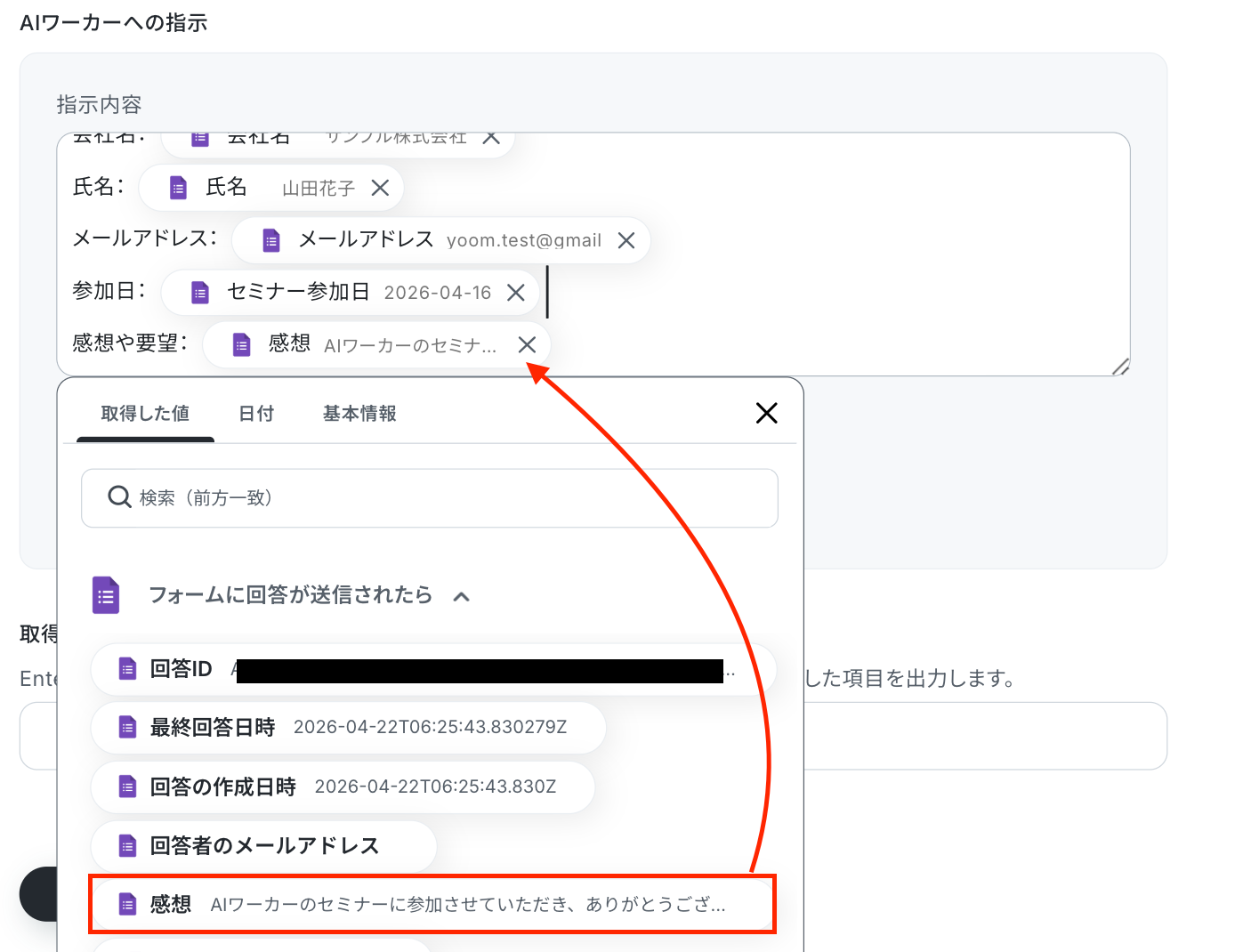 Googleフォームのトリガー設定で取得した値を引用して、設定しましょう。