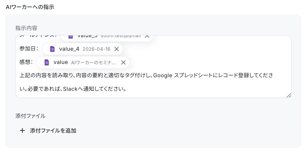 役割やマニュアルはAIワーカー自体に設定されているため、ここではAIワーカーを起動させるために命令を設定していきます。