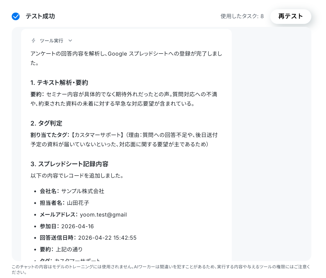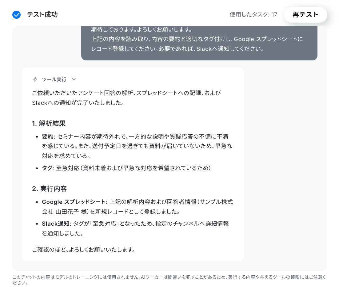 今回はテスト操作として、チャットにサンプル回答を入力し、「上記の内容を読み取り、要約と適切なタグ付けを行い、Google スプレッドシートにレコードを登録してください。」などと送信します。