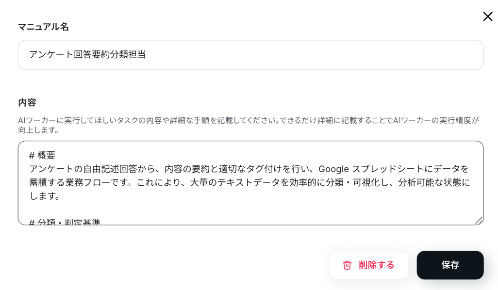 マニュアルの作り方については、【AIワーカー】マニュアルの作成方法で詳しく解説していますので、ぜひ参考にしてください。