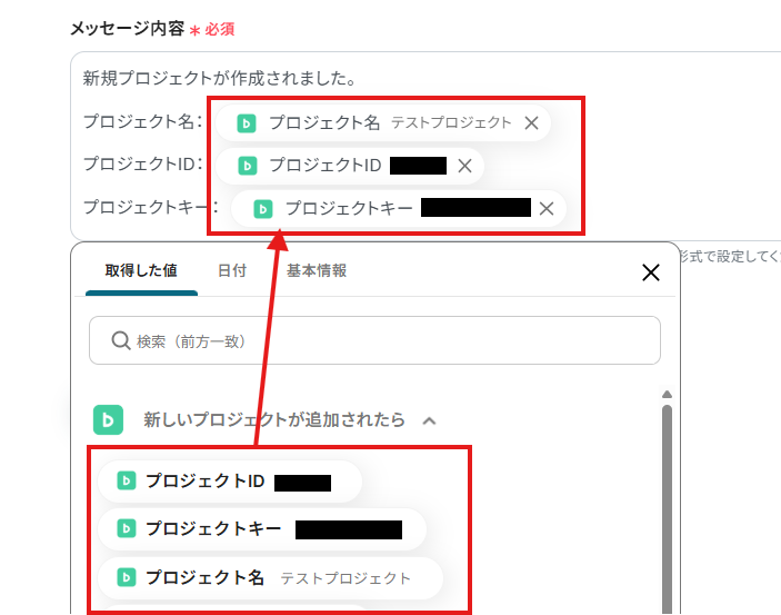 「メッセージ内容」は、入力欄をクリックして表示される取得した値から選択できます。
