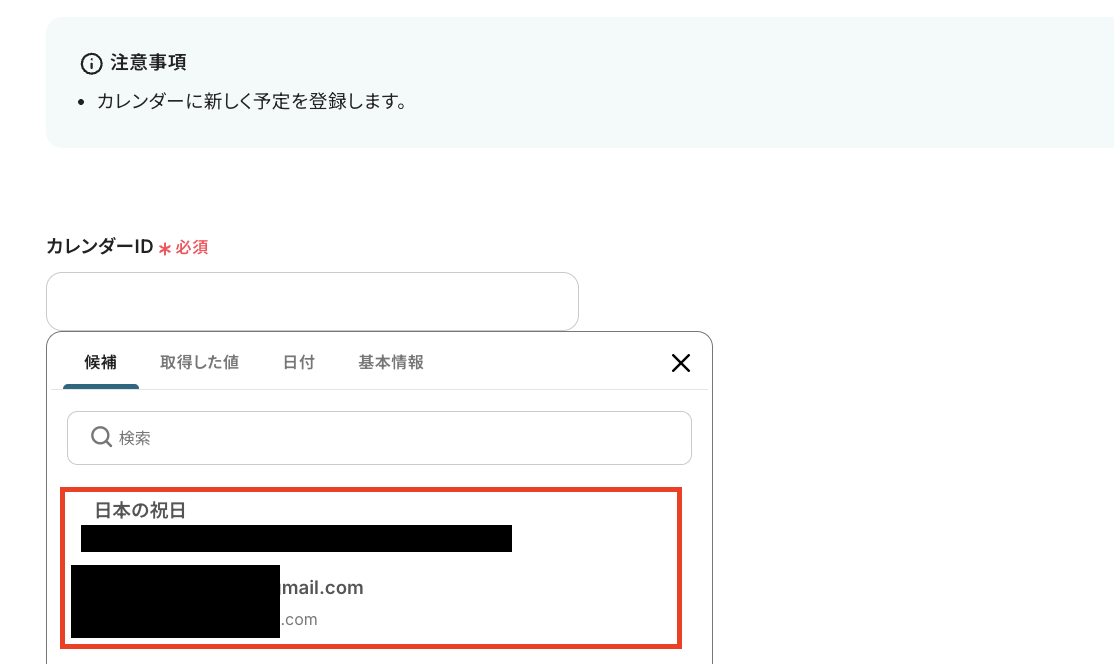 次の画面で「カレンダーID」を注釈に沿って入力してください。