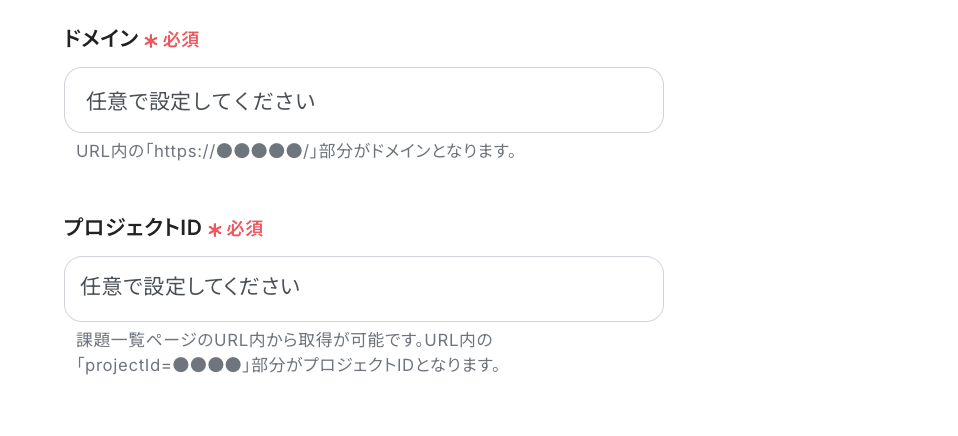 「ドメイン」と「プロジェクトID」に注釈に沿って情報を入力します。