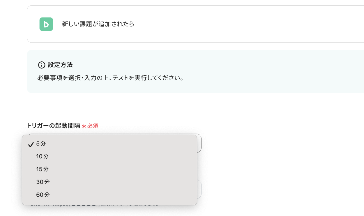 「トリガーの起動間隔」は5分、10分、15分、30分、60分から任意のものを選択してください。