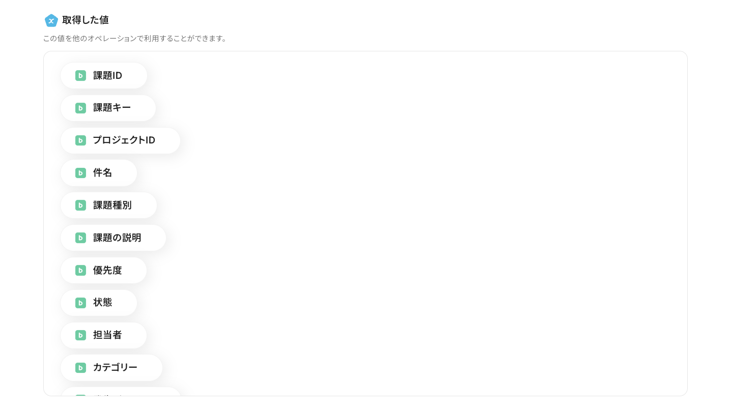 アウトプット情報は、「この値を他のオペレーションで利用することができます。」という注釈の通り、この後のステップで引用・活用できます。