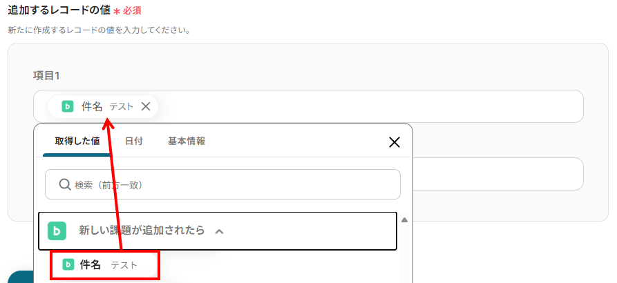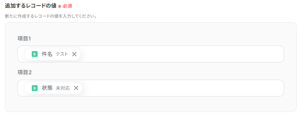 3.ここでは、先ほど指定したGoogle スプレッドシートに追加するレコードを設定していきます。 「追加するレコードの値」の、それぞれの項目欄をクリックすると下記のようなアウトプットが表示されます。 業務に合わせてそれぞれの項目を入力してください。