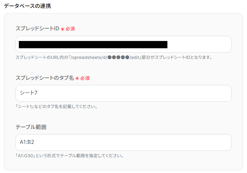 スプレッドシートのタブ名:スプレッドシートIDと同じように入力欄をクリックして、候補から選びましょう。