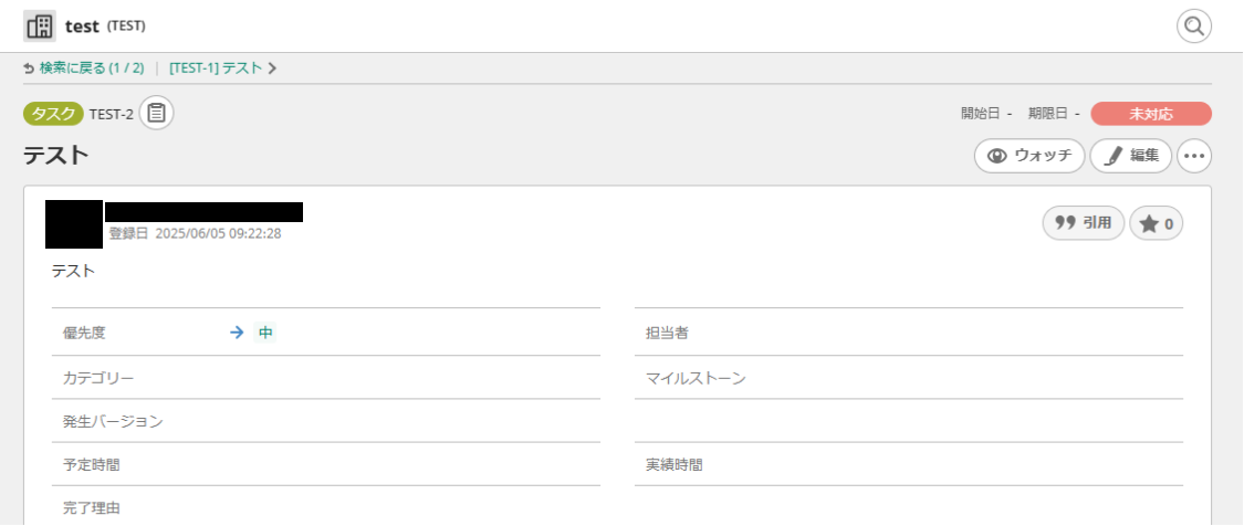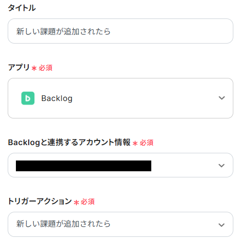 3.次に、具体的なBacklogのトリガー設定をします。 この後のテスト操作のため、Backlogに課題を新しく追加してください。 課題の内容は、架空の情報(「テスト株式会社」や「テスト太郎」など)でOKです。