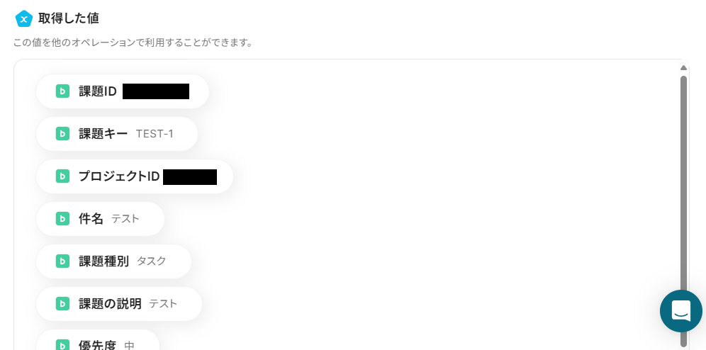 入力が完了したら、「テスト」をクリックし成功するか確認してください。 先ほど作成した課題の内容がアウトプットとして取得されていればOKです。