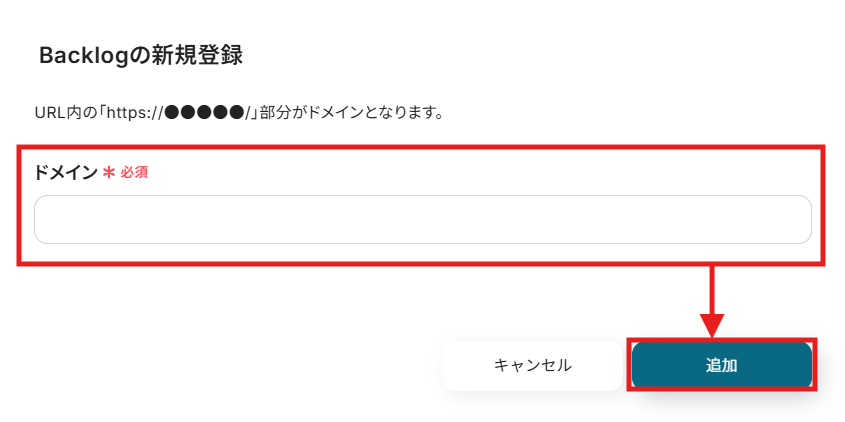 Backlogを選択できたら、BacklogのURL内のドメインを入力し、「追加」をクリックします。