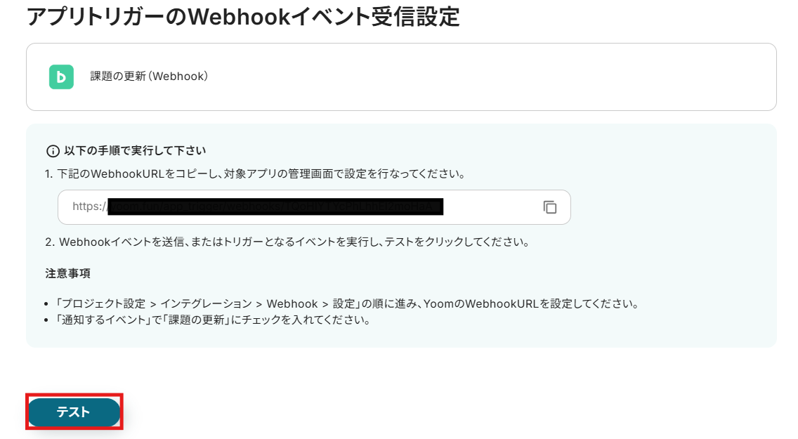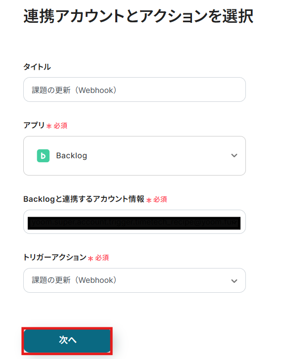 2) アクションは「課題の更新(Webhook)」が選択されていることを確認して、「次へ」をクリックします。