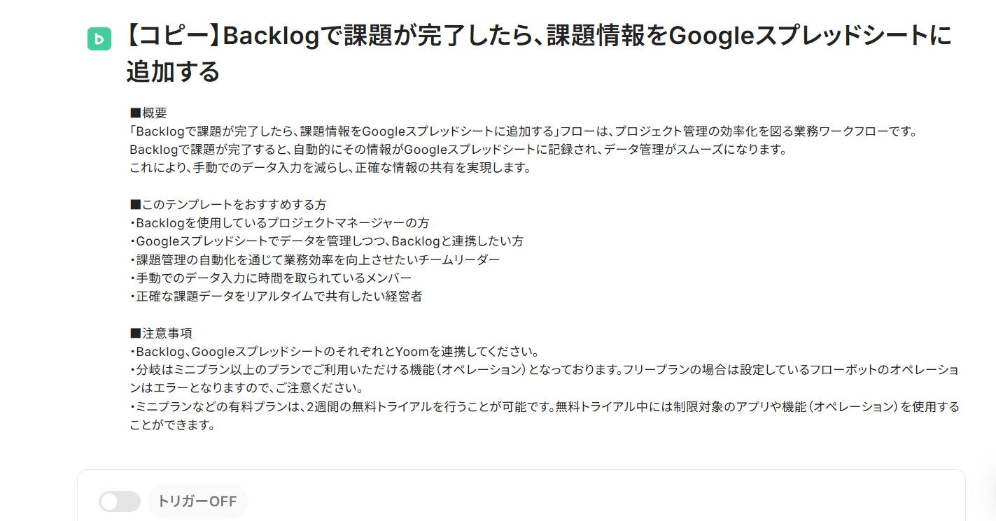「Backlogで課題が完了したら、課題情報をGoogleスプレッドシートに追加する」フローは、プロジェクト管理の効率化を図る業務ワークフローです。