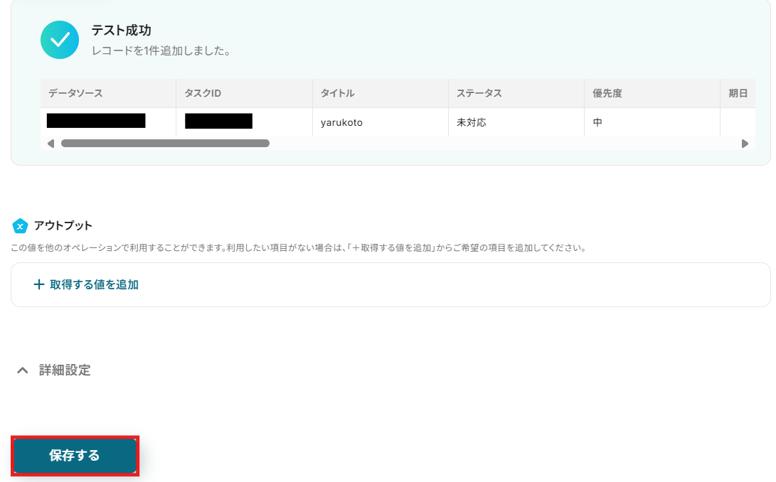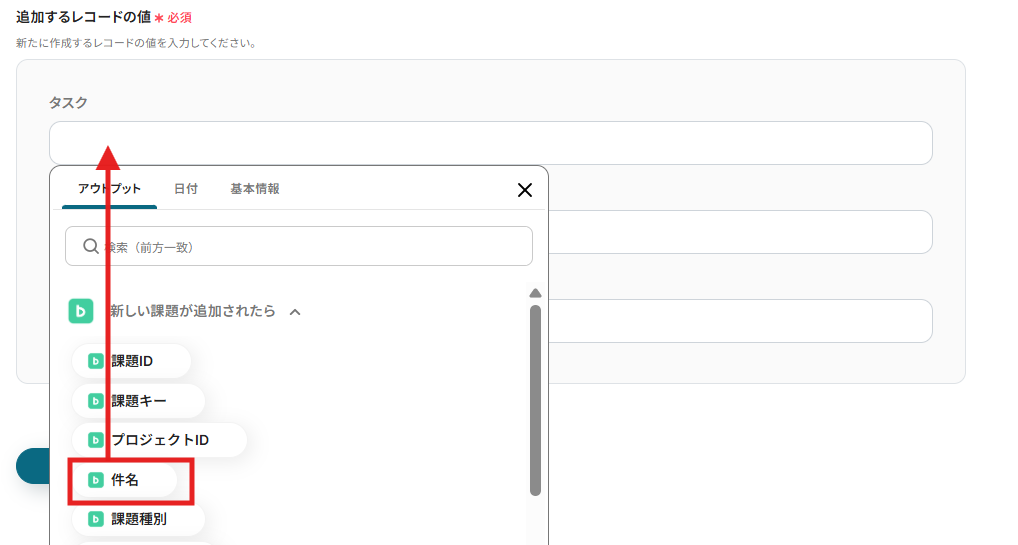 追加するレコードの入力には先ほど取得したBacklogのアウトプットを選択できます。