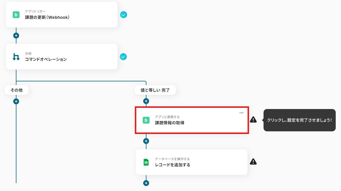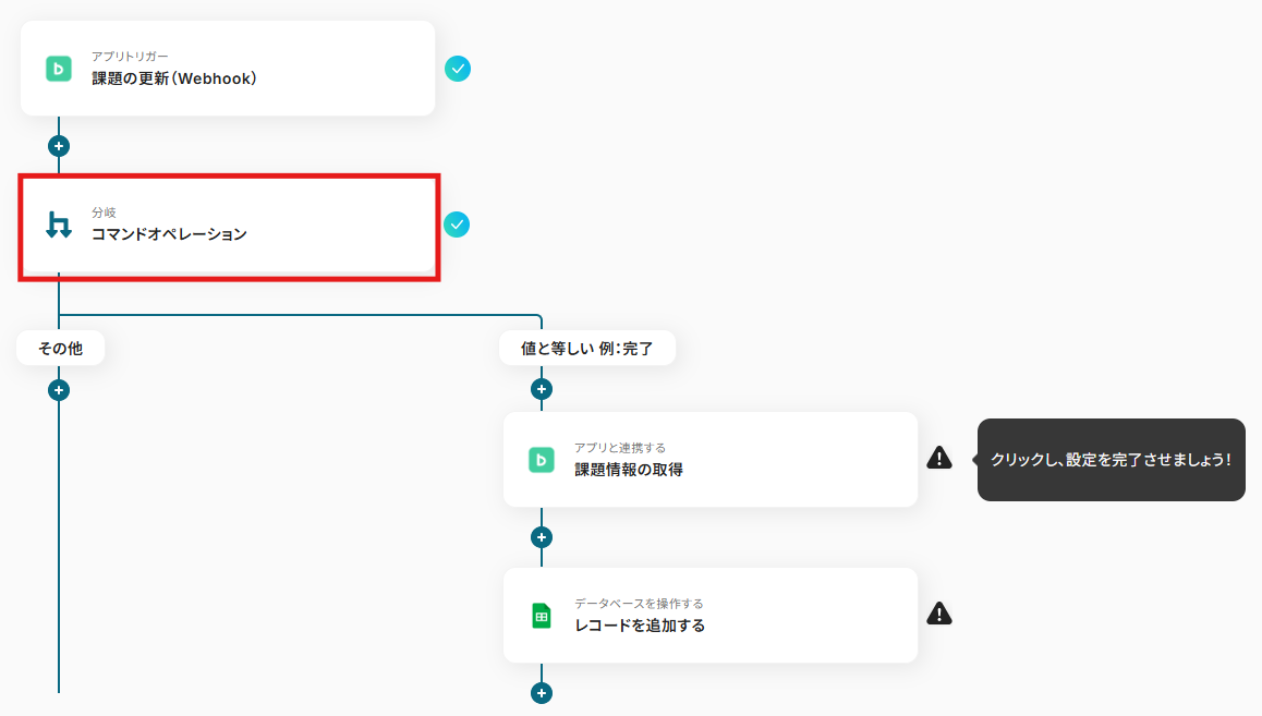これで【Backlogで課題が完了したら、課題情報をGoogleスプレッドシートに追加する】というフローが完成です。