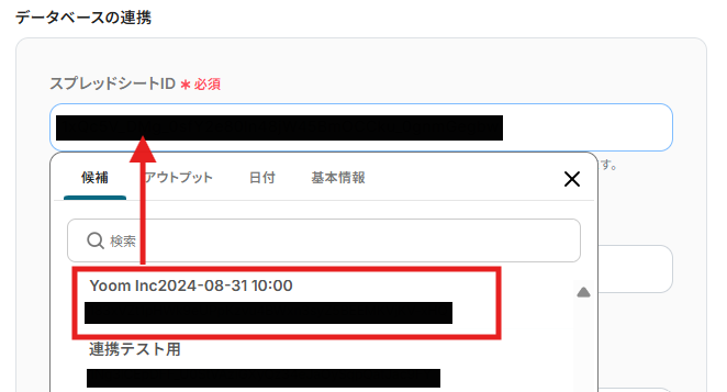 スプレッドシートIDはボックスをクリックすると連携済みのIDが表示されるので、使用したいIDを選択してください。