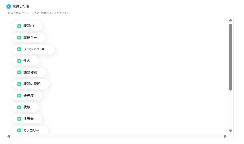 テストが成功した場合は、アウトプット(取得した値)を取得できます。実際の設定では、各項目に具体的な値が反映されます。