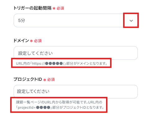 (トリガーは5分、10分、15分、30分、60分の間隔で起動間隔を選択できます。プランによって最短の起動間隔が異なりますので、ご注意ください。)