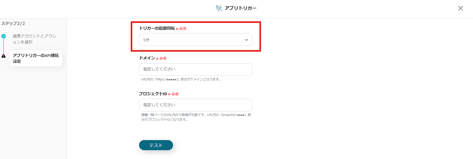 トリガーは5分、10分、15分、30分、60分の間隔で起動間隔を選択できます。