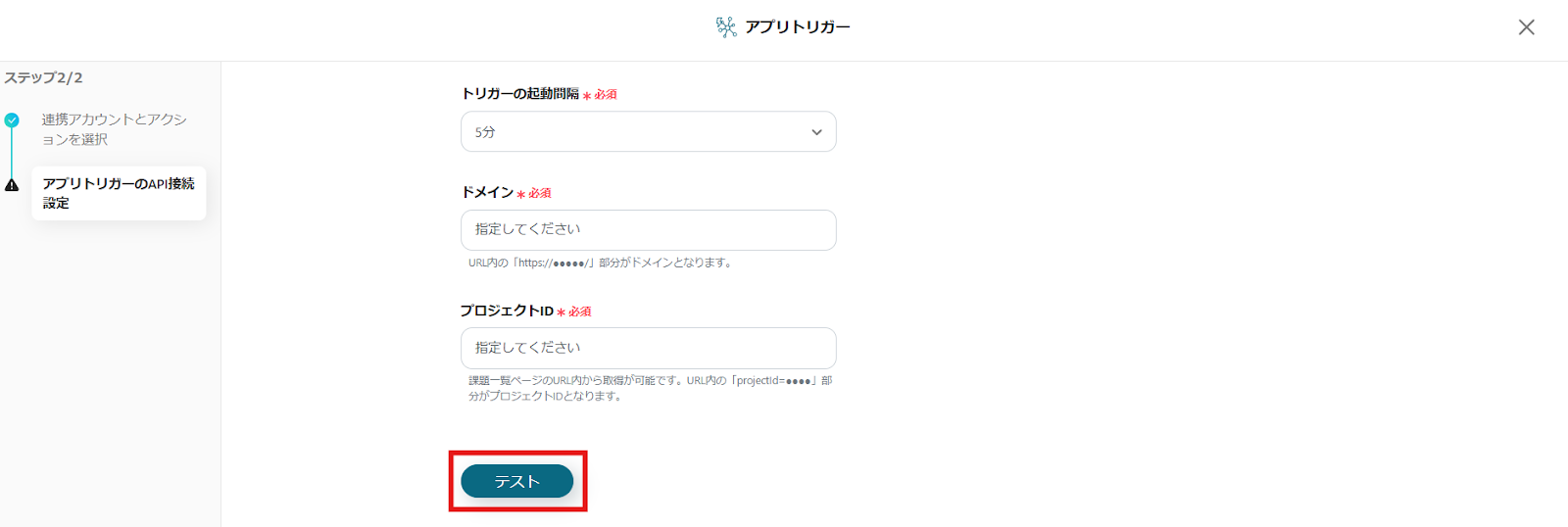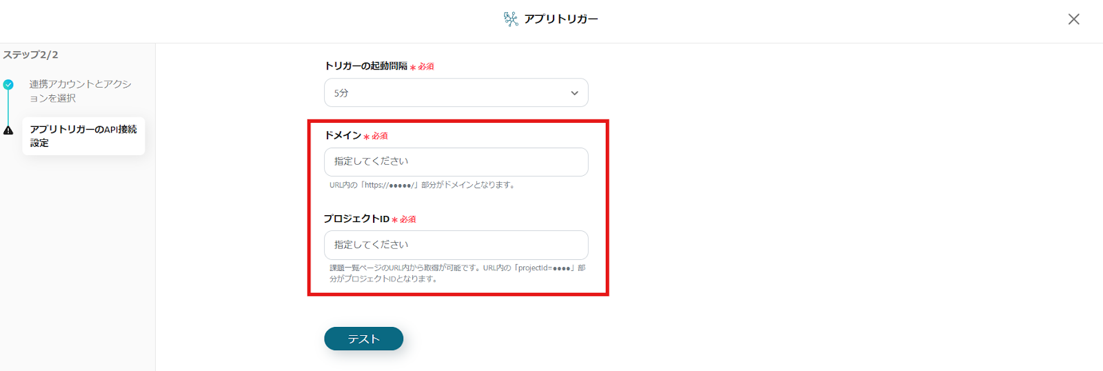 ドメインの設定と、どのプロジェクトに課題が追加されたらフォルダを作成するのか指定します。