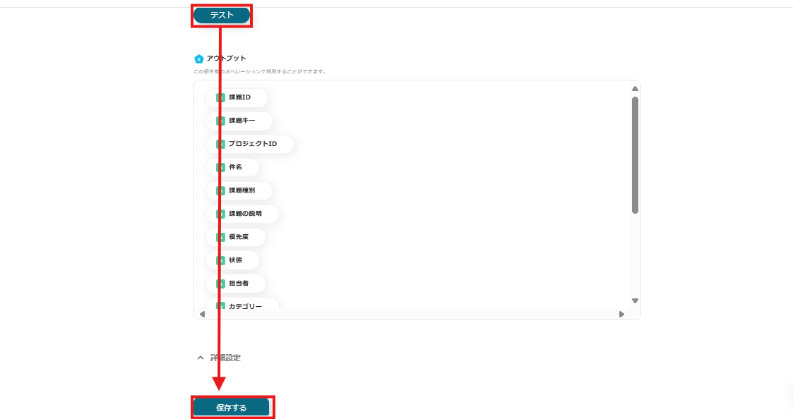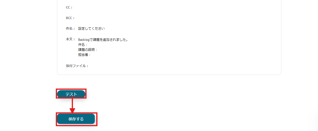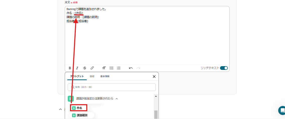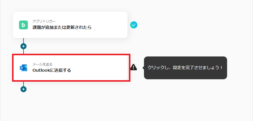 このように設定することで、Backlogで課題が追加されたら「件名」、「課題の詳細」、「担当者」を取得し、Outlookのメールに自動で引用し送付できます。