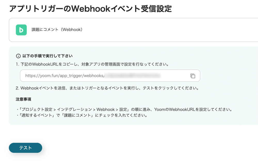 Backlogの設定が終わったら、Yoomの画面に戻りテストボタンをクリックします。