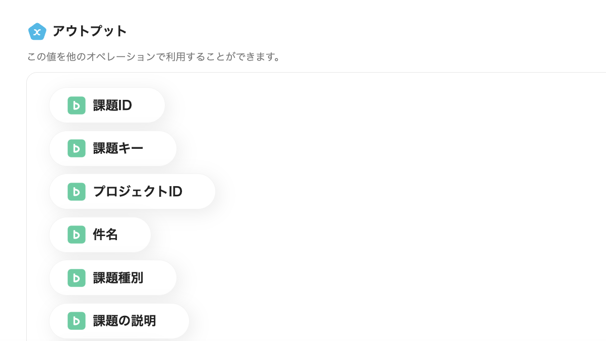 アウトプット情報は、「この値を他のオペレーションで利用することができます。」という注釈の通り、この後のステップで引用・活用できます。