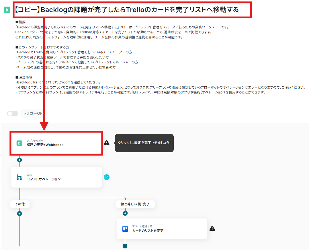 「Backlogの課題が完了したらTrelloのカードを完了リストへ移動する」フローは、プロジェクト管理をスムーズに行うための業務ワークフローです。