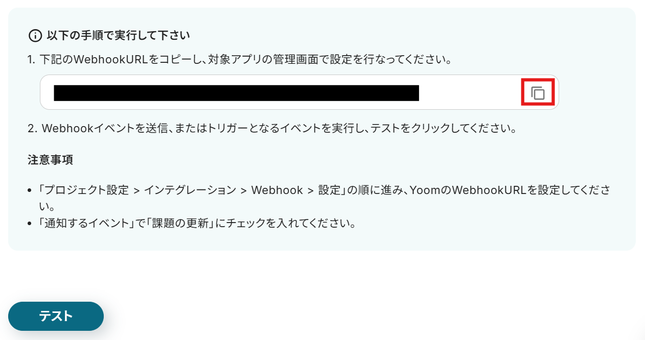 以下の画面が表示されたら、赤枠内をクリックしてWebhook URLをコピーします。