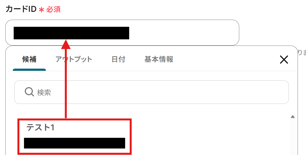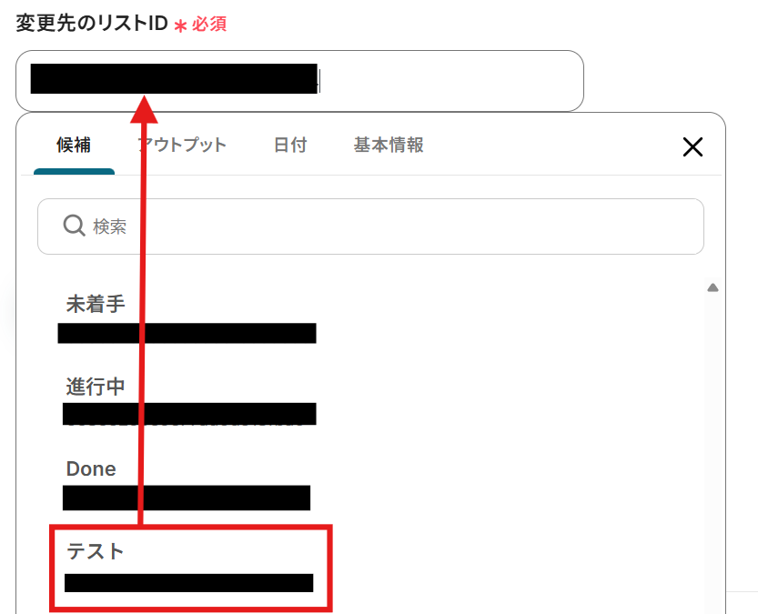 「変更先のリストID」は「カードID」を選択すると候補から選択ができます。
