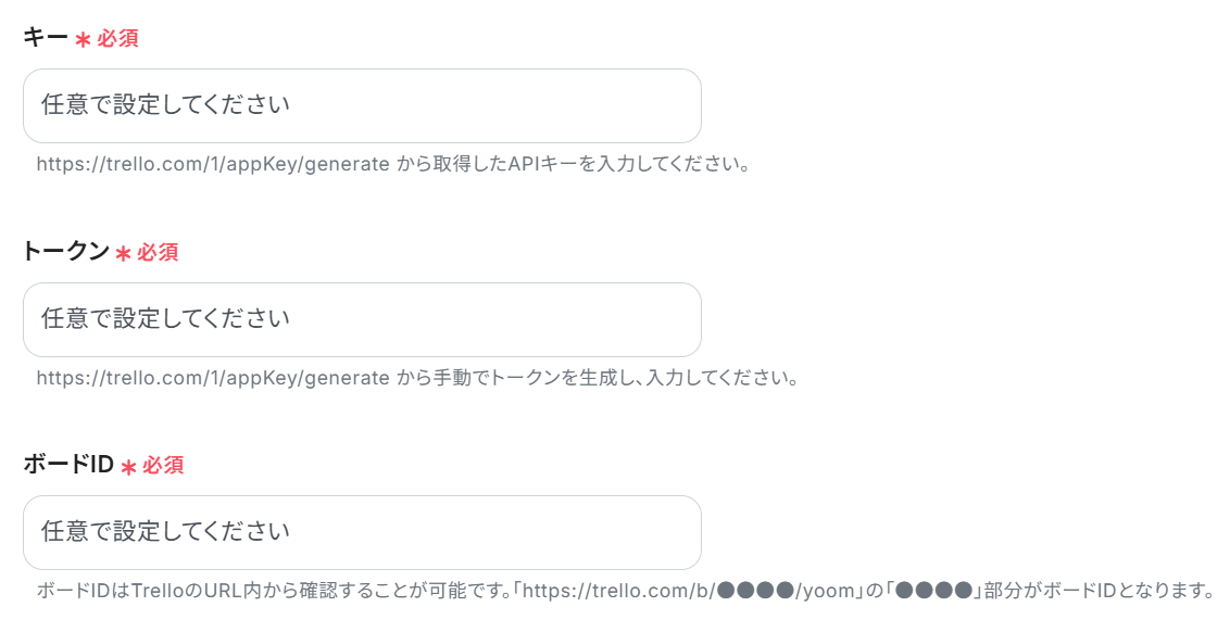 スクロールし、「キー」、「トークン」、「ボードID」を説明に従って設定しましょう。