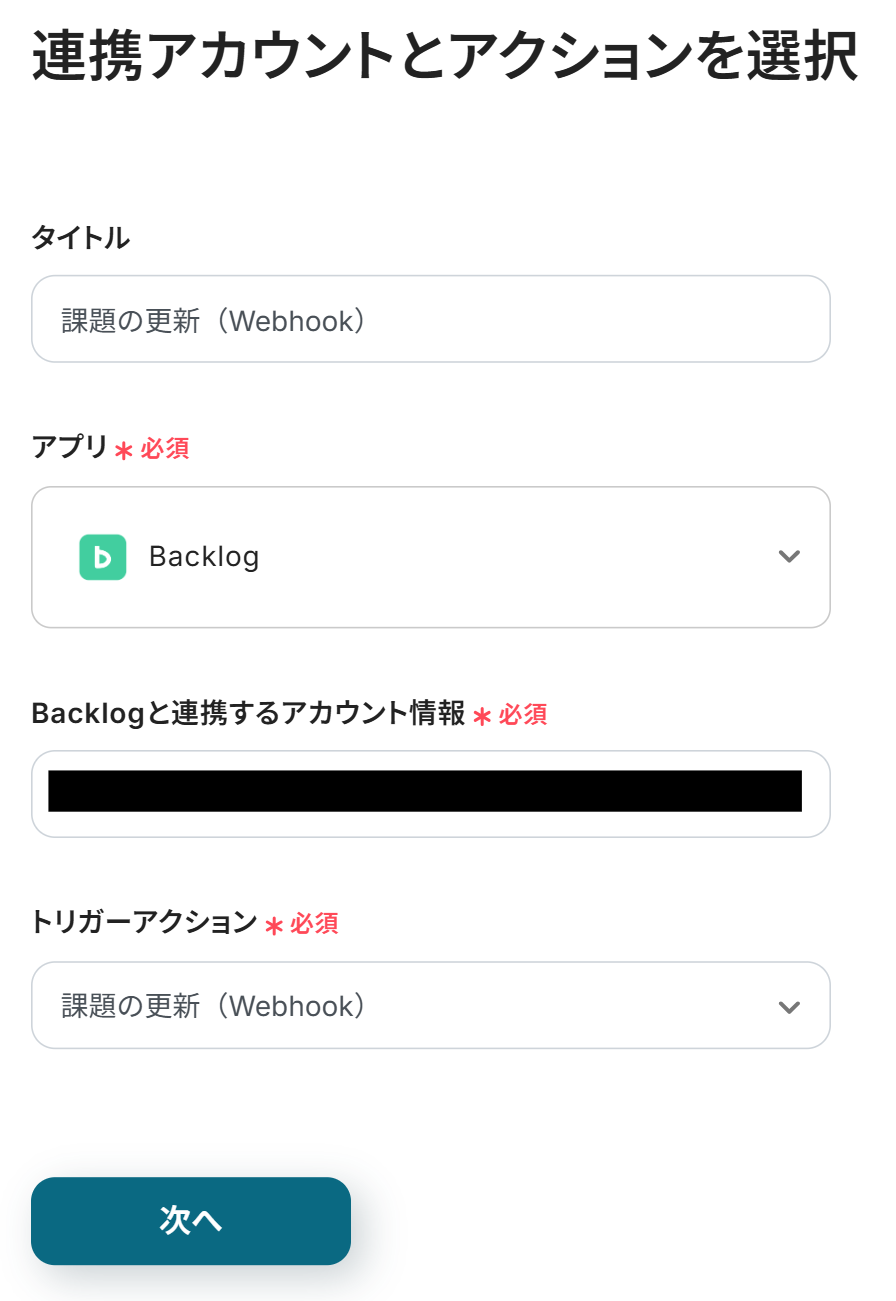 最初に、Backlogの課題が更新されたらフローボットを起動する設定を行うため、「課題の更新(Webhook)」をクリックします。