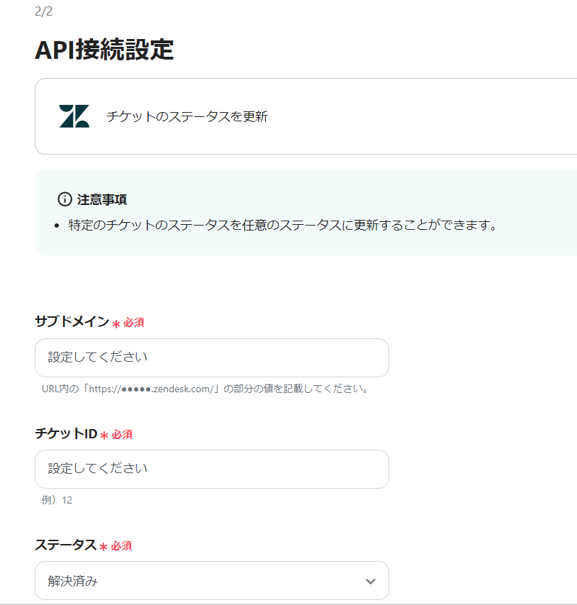 ・Zendeskはチームプラン・サクセスプランでのみご利用いただけるアプリとなっております。フリープラン・ミニプランの場合は設定しているフローボットのオペレーションやデータコネクトはエラーとなりますので、ご注意ください。