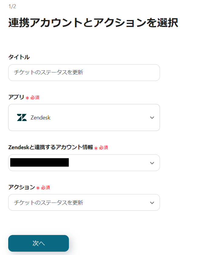 9) アクションは「チケットのステータスを更新」を選択し、「次へ」をクリックします。